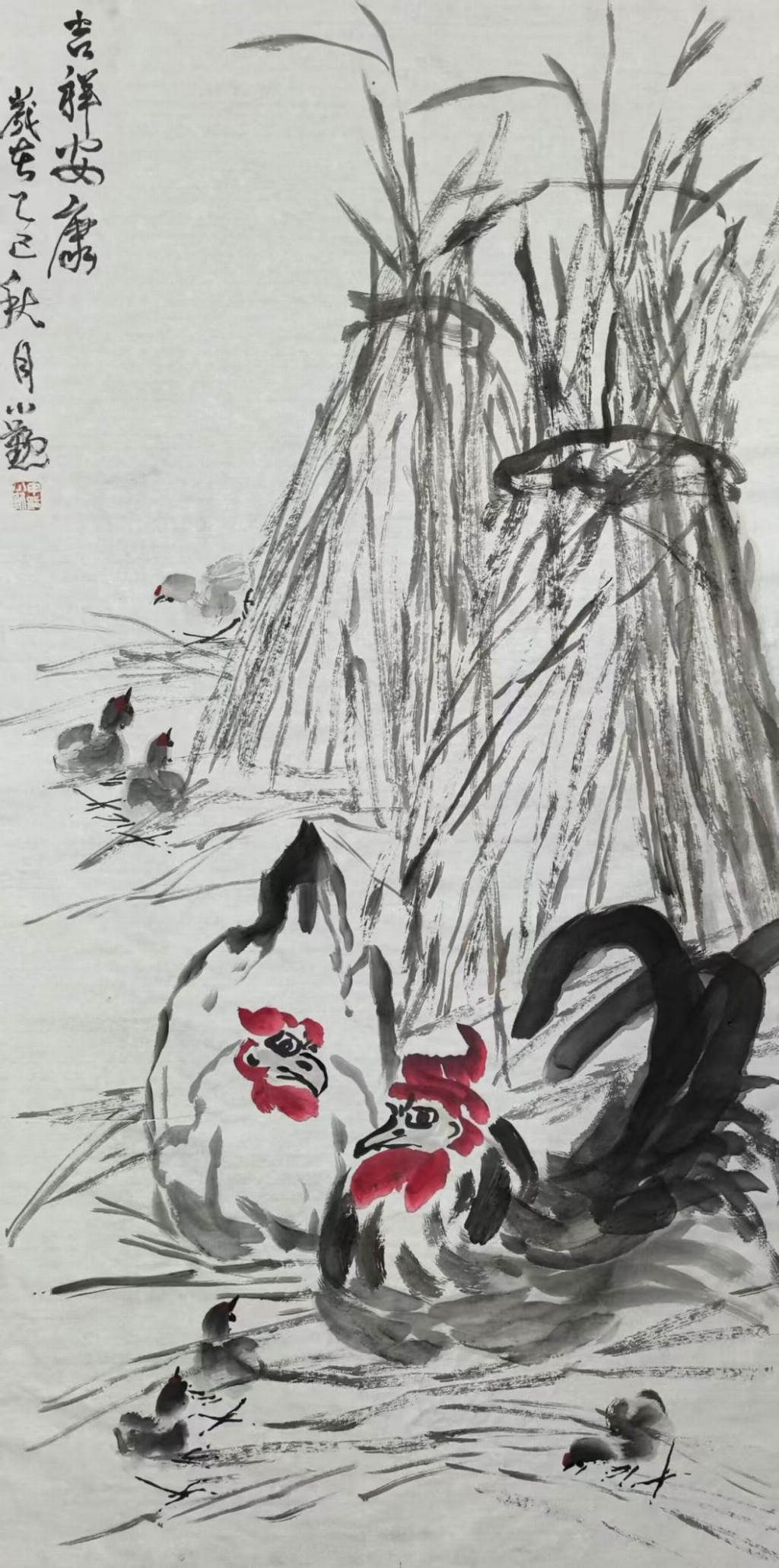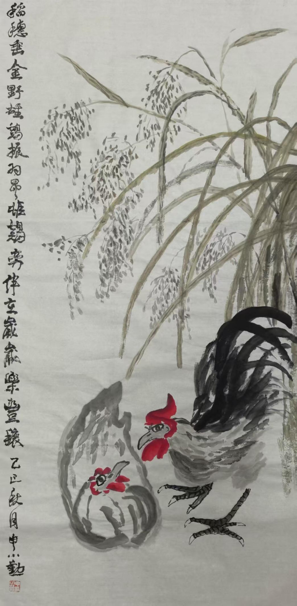 在中国画的传统题材中,“鸡”因其与“吉”谐音,兼具“五德”(文、武、勇、仁、信)之誉,历来是画家乐于表现的对象。然而,能将这一寻常家禽画出风骨、绘出魂魄者,实属凤毛麟角。观申小勤女士笔下的鸡,我们看到的不仅是一种题材的延续,更是一种精神的镌刻与生命的礼赞。她的画作,以金石之力为骨,以锦绣华彩为魂,在具象与意象之间,构建了一个雄浑高华、生机勃勃的艺术世界。